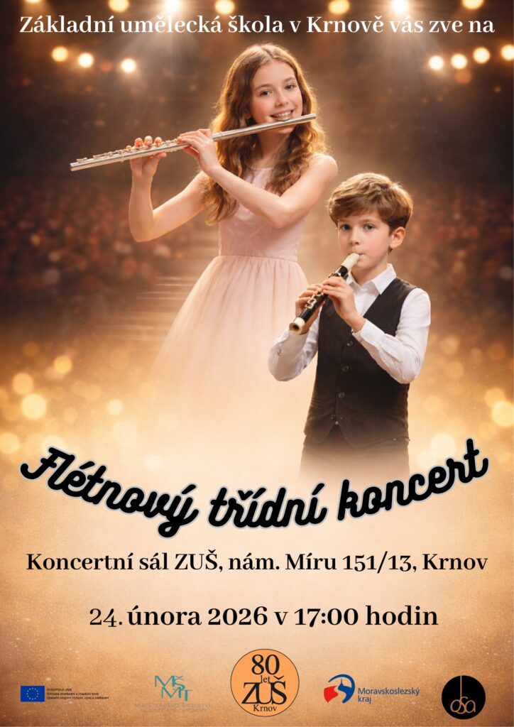 srdečně Vás zveme na Flétnový koncert žáků pedagožky Kateřiny Vidličkové, který se uskuteční v úterý 24. února 2026 v 17:00 hod. v Koncertním sálu ZUŠ Krnov na nám. Míru 151/13, Krnov.