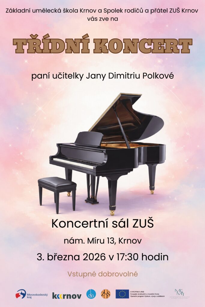 Koncert se uskuteční 5. března 2026 v 17:00 hod., v Koncertním sále ZUŠ Krnov.