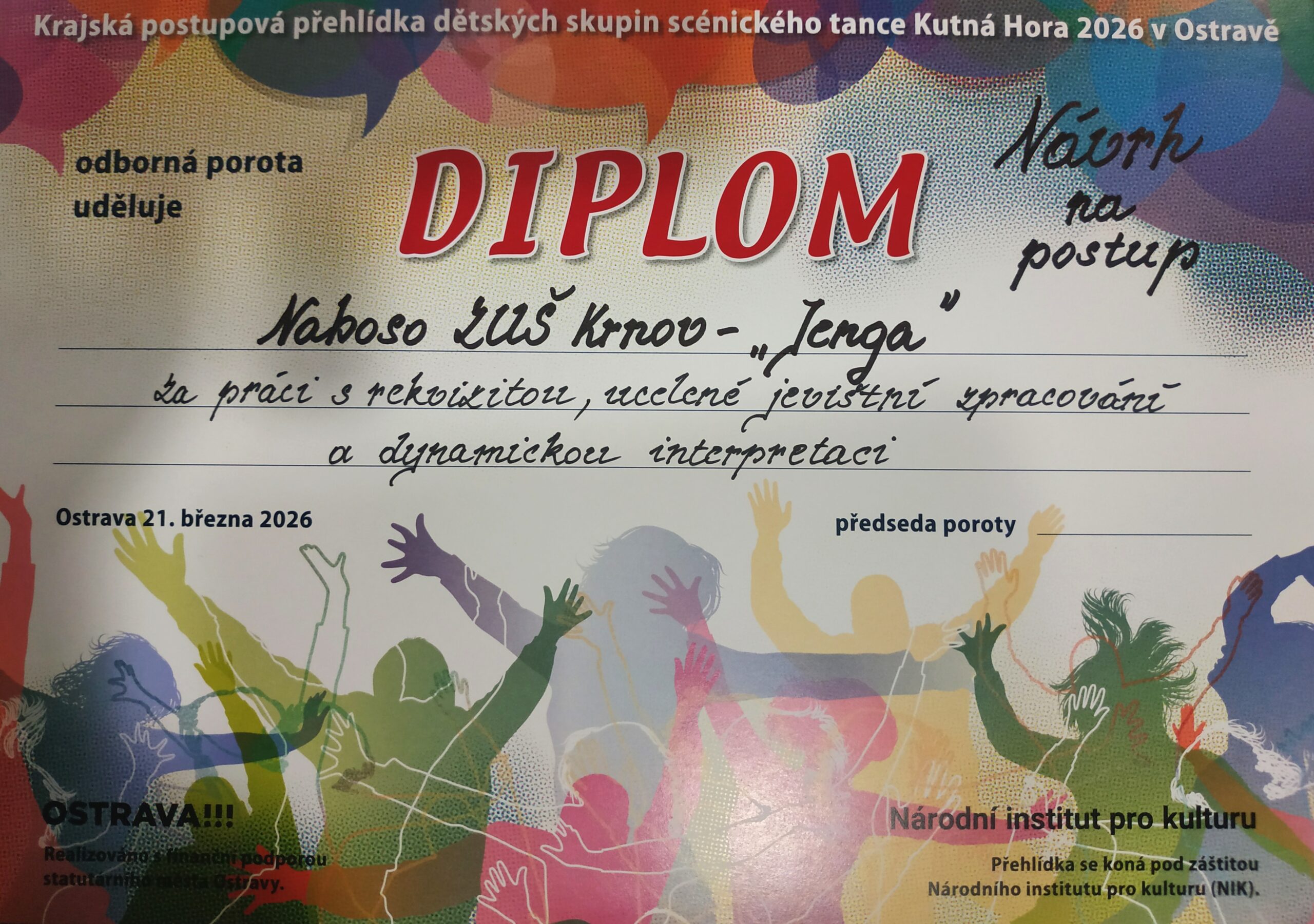 Mladší tanečnice ve věku 10-11 let se svou choreografií „Jenga“ rozehrály na jevišti opravdu nebezpečnou hru, která se nakonec vyplatila. Nejenže získaly ocenění poroty „Za práci s rekvizitou, ucelené jevištní zpracování a dynamickou interpretaci“, ale k naší veliké radosti také jednu ze dvou nominací na 42. Celostátní přehlídku dětských skupin scénického tance, které se uskuteční 14. až 17. května 2026 v Městském Tylově divadle v Kutné Hoře.