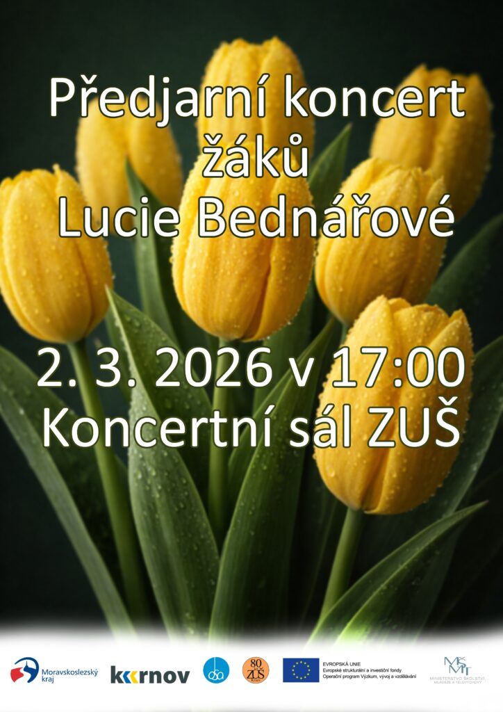 dovolujeme si vás pozvat na Předjarní koncert žáků pedagožky MgA. Lucie Bednářové, který se uskuteční v pondělí 2. března 2026, od 17:00 hod., v našem Koncertním sále ZUŠ Krnov.