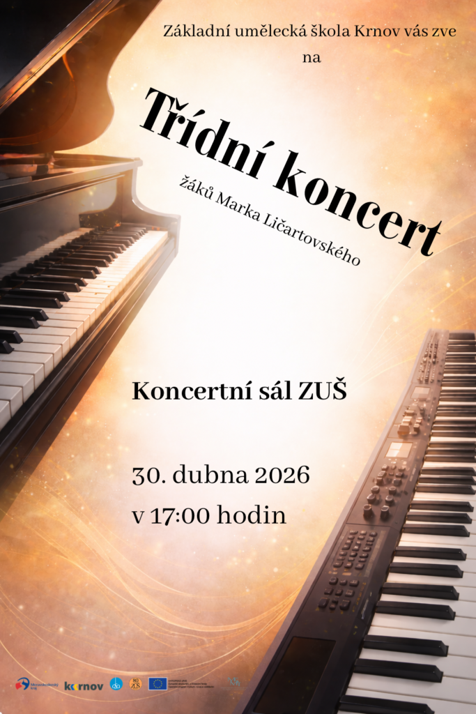 srdečně vás zveme na třídní koncert žáků pedagoga Marka Ličartovského, který se uskuteční ve čtvrtek 30. dubna 2026 od 17:00 hod. v Koncertním sále ZUŠ Krnov.