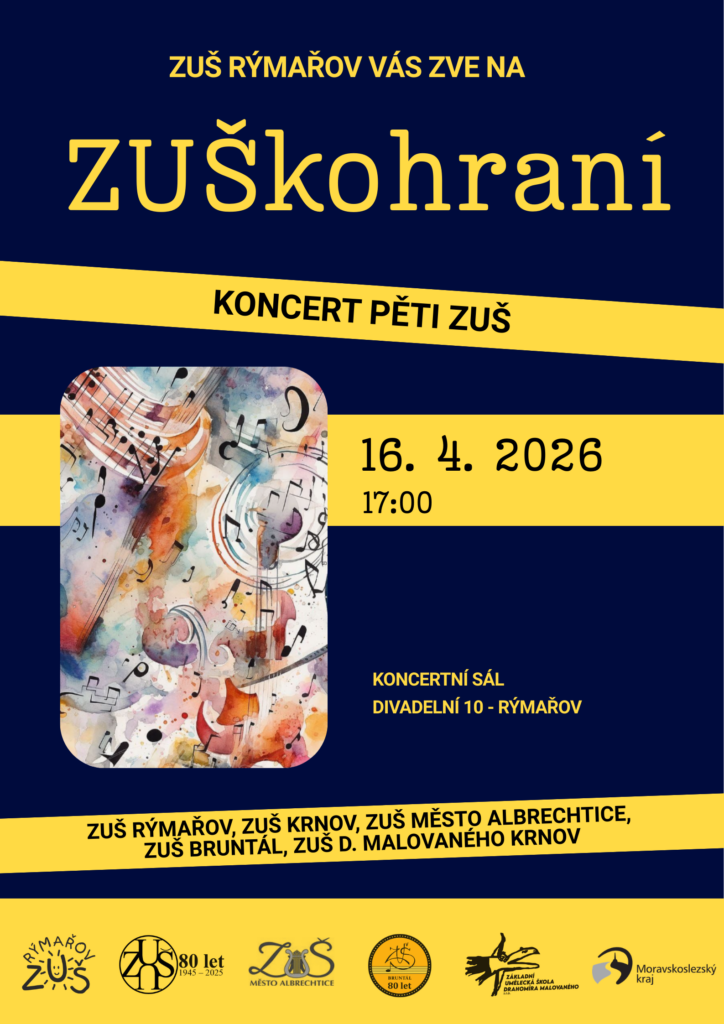 dovolujeme si vás co nejsrdečněji pozvat na 3. ročník společného projektu ZUŠkohraní, který v letošním roce organizačně zajišťuje ZUŠ Rýmařov. Účastní se ho pět škol našeho okresu: ZUŠ Krnov, ZUŠ Rýmařov, ZUŠ Město Albrechtice, ZUŠ Bruntál a soukromá ZUŠ Drahomíra Malovaného Krnov.