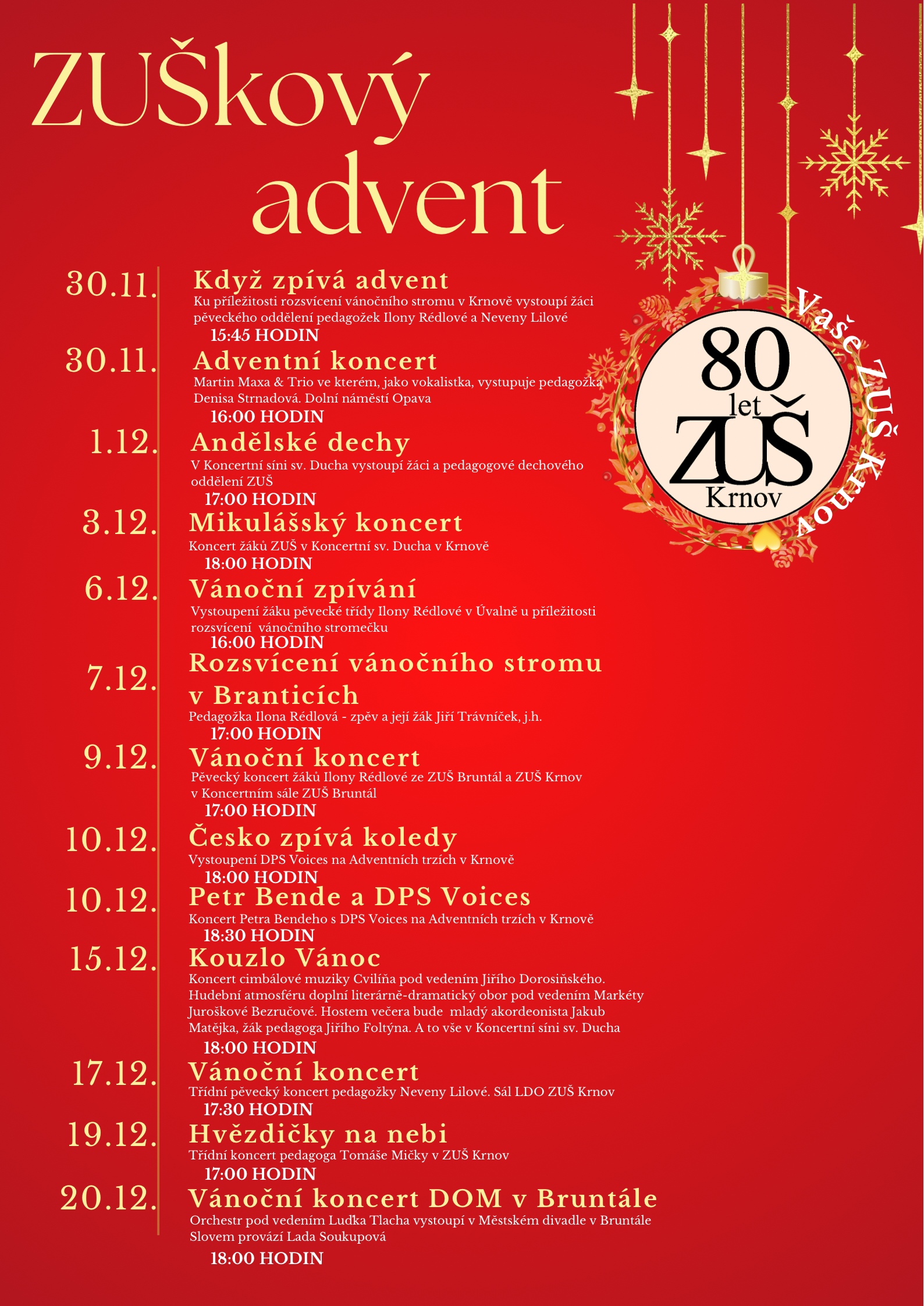 na připraveném plakátu naleznete všechny naše akce v adventu, od rozsvícení stromu na krnovském náměstí, Mikulášského koncertu a Andělských dechů, přes vánoční zpívání v Krnově, Branticích i Bruntále, až po Kouzlo Vánoc s cimbálovou muzikou Cvilíňa.